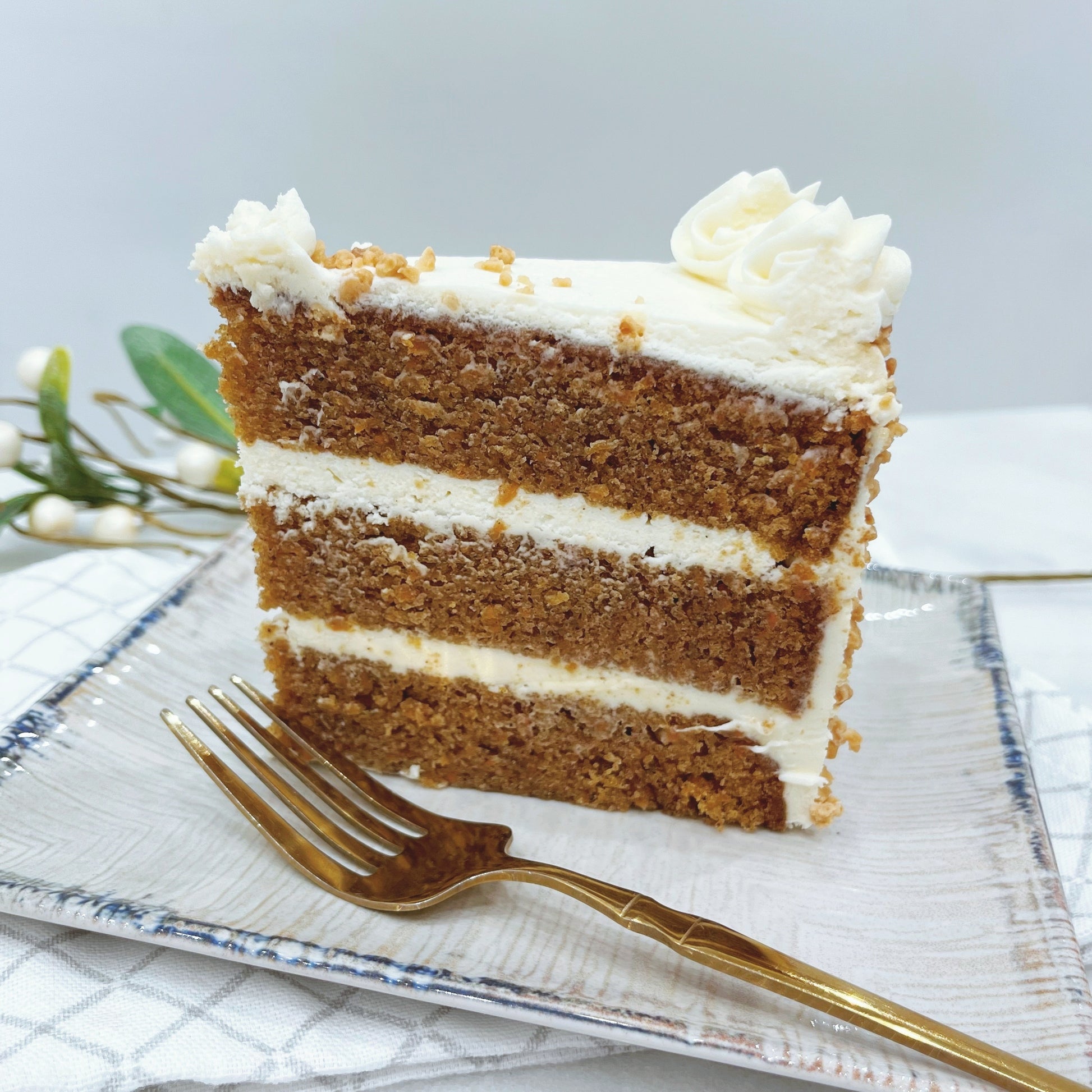 Cada capa está delicadamente cubierta con un suave y cremoso frosting de queso, aportando el toque perfecto de frescura y sabor. Su acabado impecable y su aroma irresistible convierten a esta tarta en la elección ideal para cualquier celebración o para disfrutar de un momento especial en tu día.